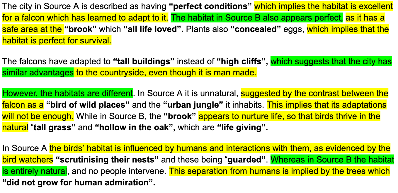 as before “all life loved the brook” and now in Source B “people below were unaware” of the birds, conveying how humans don’t value the birds and don’t care about where they live, as the peregrine “was very much a bird of wild places, not the urban jungle.”