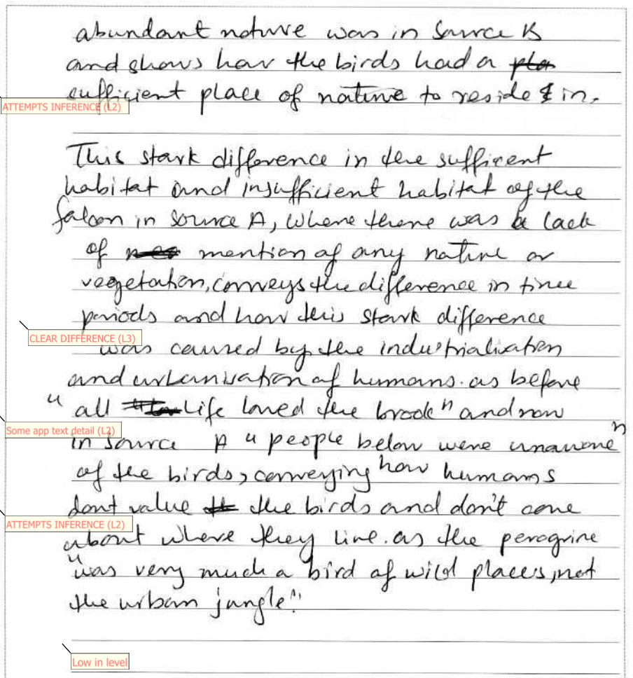 This has two explanations and two quotes about the habitat. There are no marks for the quote about the falcon, as that is not what the question asked. There is one mark for one quote and an explanation. 1 mark.